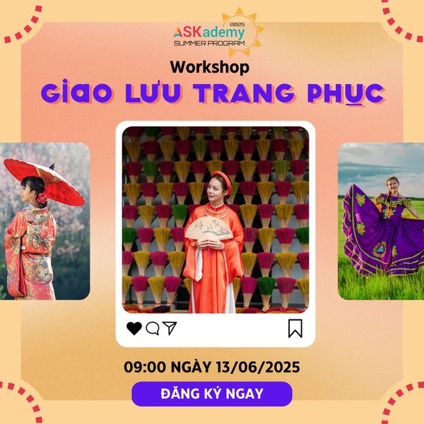 Không để các bạn phải tìm hiểu một mình, 𝐀𝐒𝐊𝐚𝐝𝐞𝐦𝐲 sẽ mang đến một hành trình khám phá đầy màu sắc qua Workshop đầu tiên trong chuỗi Hoạt động hè với nội dung "Giao lưu Trang phục Truyền thống" – nơi các Học viên được chiêm ngưỡng, tìm hiểu và hóa thân thành những công dân toàn cầu!