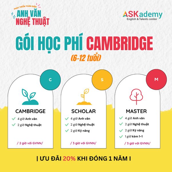 Gói CAMBRIDGE (6–15 tuổi): Phát triển khả năng ngôn ngữ học thuật, tư duy sáng tạo & kỹ năng sống – giúp bé tự tin học tập, giao tiếp và phát triển toàn diện.